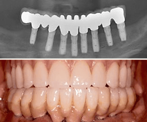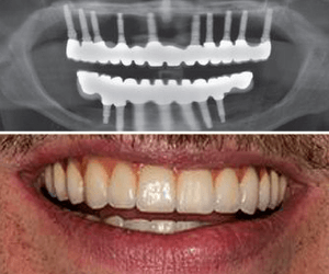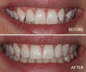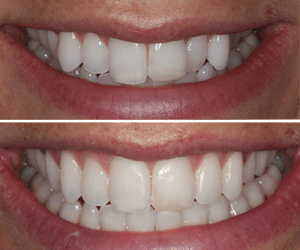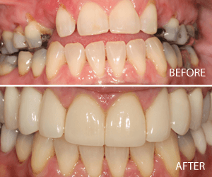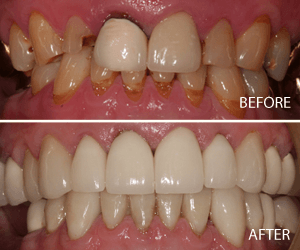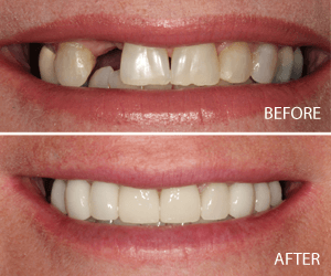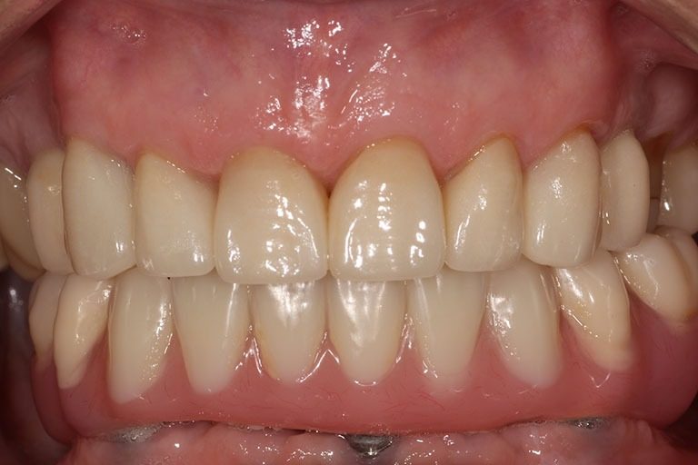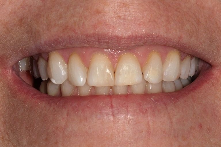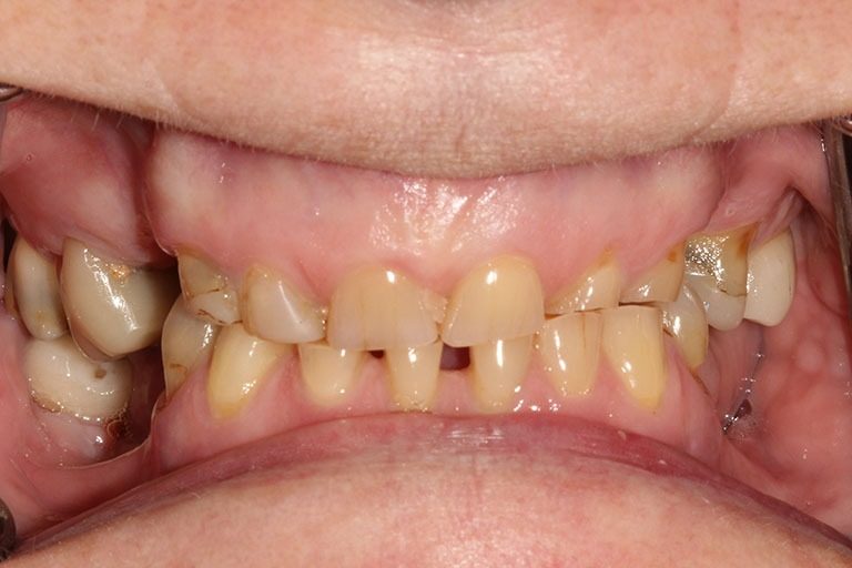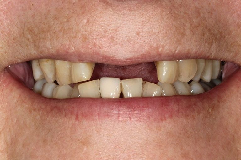 Mary* was embarrassed of her smile and wanted to fix the gap from her missing front teeth and the colour and shape of her teeth. Since she has terminal gum disease, decay, missing teeth and significant wear, giving her a healthy foundation to build on was imperative. Then we addressed aesthetic issues by placing 2 dental implants to replace her missing front teeth, and a full mouth of porcelain veneers.