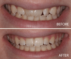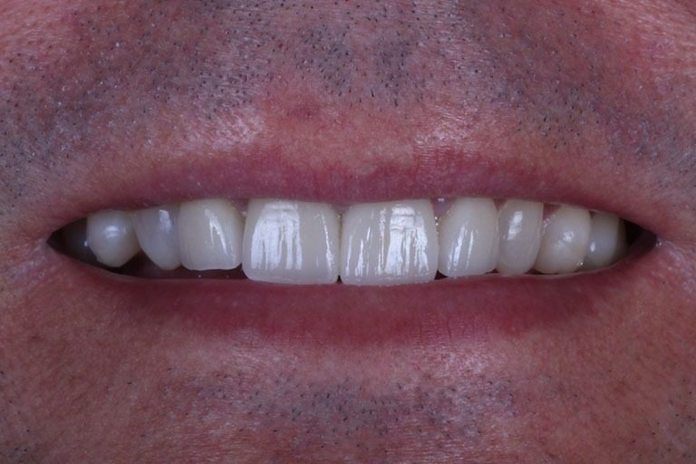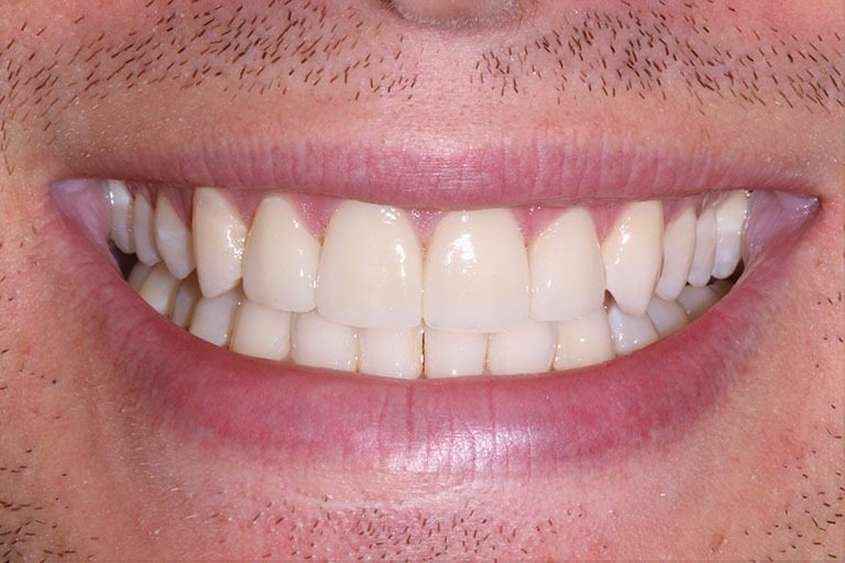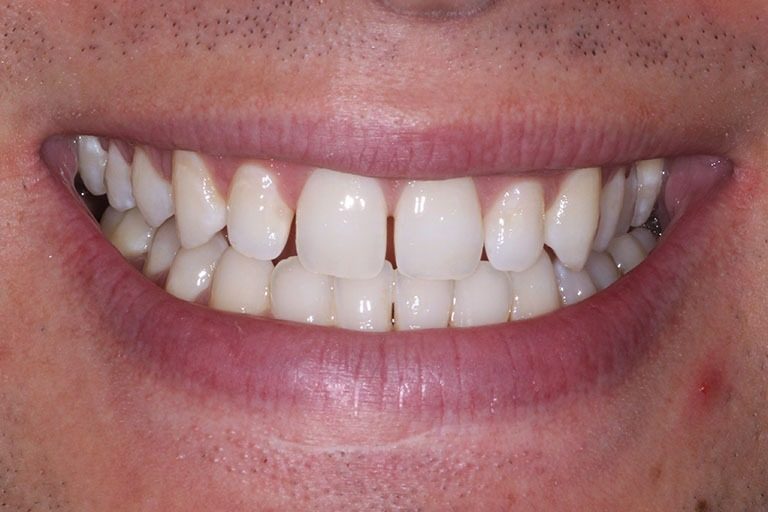 John* didn’t like how he couldn’t really see his teeth when he smiled and the teeth that he did see were crooked or misshapen. With a combination of 4 veneers, composite build-ups, composite bonding & a KOIS appliance we were able improve the colour, shape and position of his worn down teeth as well as correct his bite. He was thrilled with the natural looking result!