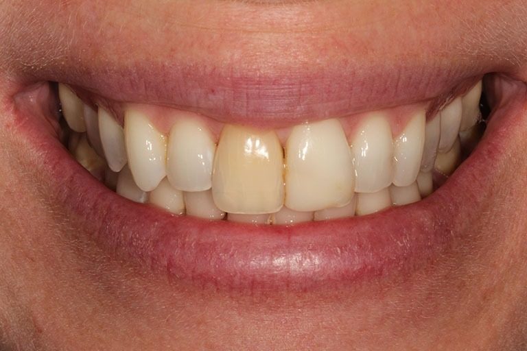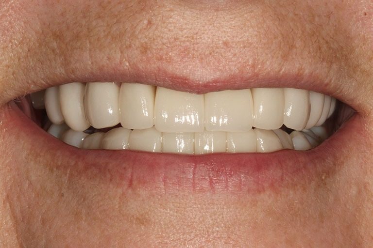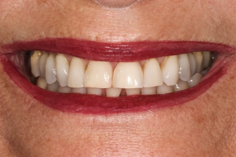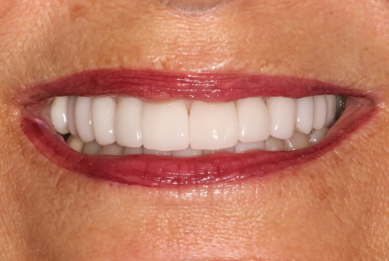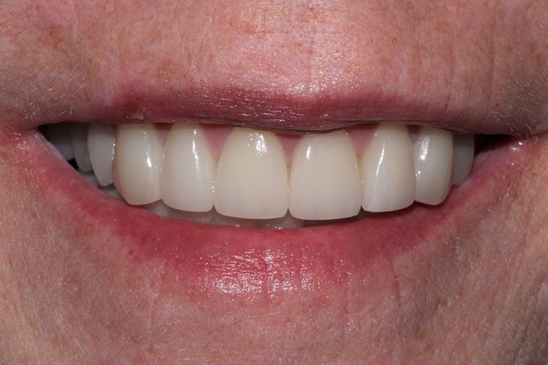 Sarah* was self-conscious of her smile. She told us “I don’t like how I can’t see my teeth when I smile and they’re getting so short I have trouble eating”. She was experiencing joint problems and wasn’t happy with the colour and shape of her small worn-down teeth. Plus she had some missing teeth that were causing her teeth to move. To help Sarah* smile with confidence again we transformed her smile with a full-mouth restoration, which entailed an implant secured lower denture & on her upper we did a combination of implants, crowns and veneers.